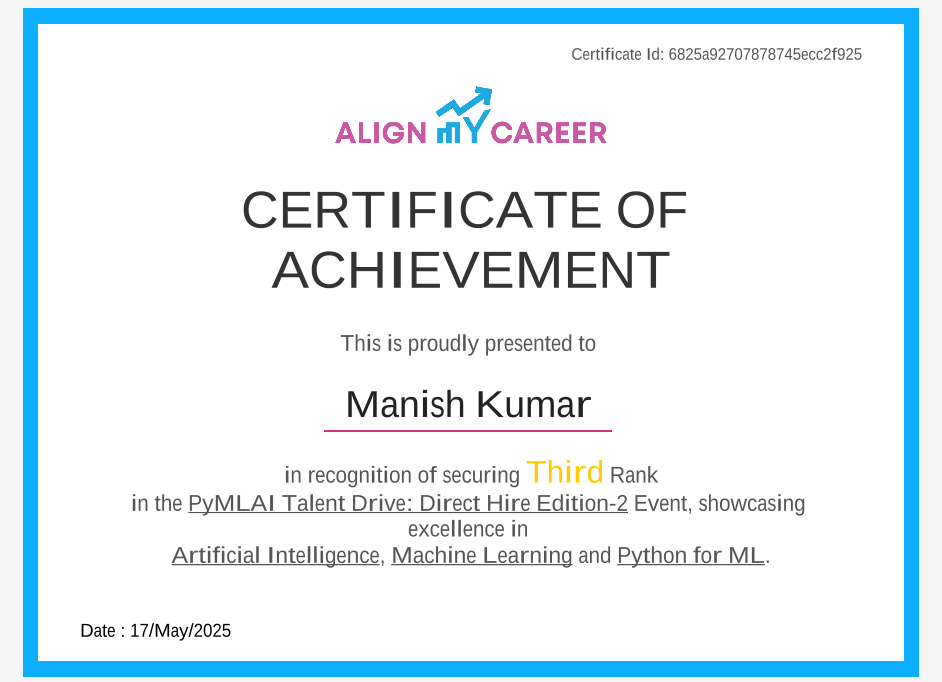 The above certificate verifies that Manish Kumar has achieved 'Third' rank in the 'PyMLAI Talent Drive: Direct Hire Edition-2' event on 17/May/2025 hosted on AlignMyCareer.